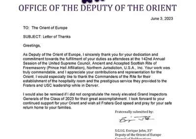 Congratulations to our new Grand Inspectors General James Biven, Alexander Ealy, Emmanuel Ganayo, and Antonio Jurrilla. We look forward to continued great works from all of you. Please enjoy!